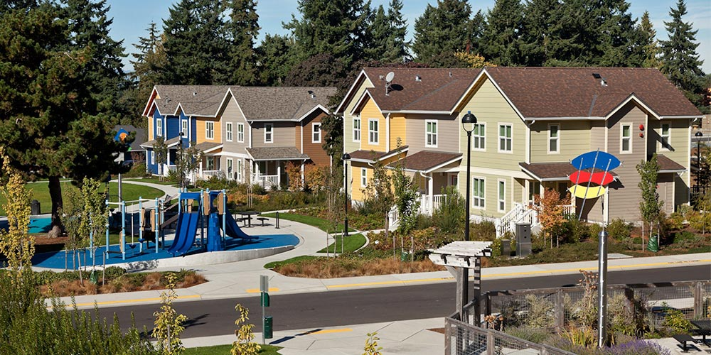 Completed in 2001, the Village at Overlake Station reflects a commitment to smart growth. It purposely places affordable housing near jobs, retail stores, and social services. Located next to a transit center in Redmond, it also offers convenient, car-free access to the Eastside. The community’s design and location help reduce urban sprawl, limit the need for parking, and ease traffic congestion.